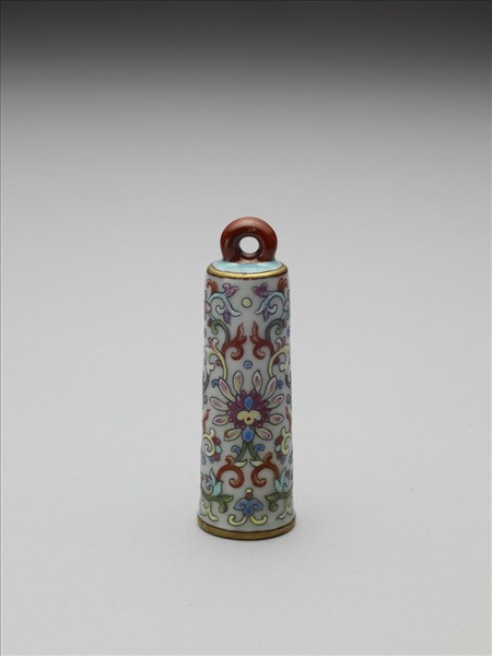翎管,插飾羽翎的管狀飾物。平頂,直筒形,器身上小下大,中空,無底,以插翎其中;頂端帶環形繫,使與帽相銜。管身飾白地粉彩纏枝花卉,上下緣飾金邊。器裡作淺藍色。