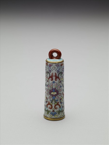 翎管,插飾羽翎的管狀飾物。平頂,直筒形,器身上小下大,中空,無底,以插翎其中;頂端帶環形繫,使與帽相銜。管身飾白地粉彩纏枝花卉,上下緣飾金邊。器裡作淺藍色。