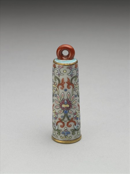 翎管是清代宮廷官員冠帽上的飾物。平頂,直筒形,器身上小下大,中空,無底,以插翎其中;頂端帶環形繫,使與帽相銜。管身飾以黑邊鉤勒輪廓線的番蓮花、朵花、卷葉紋,並填以各色彩料。上下緣飾金邊,器裡作淺藍色。