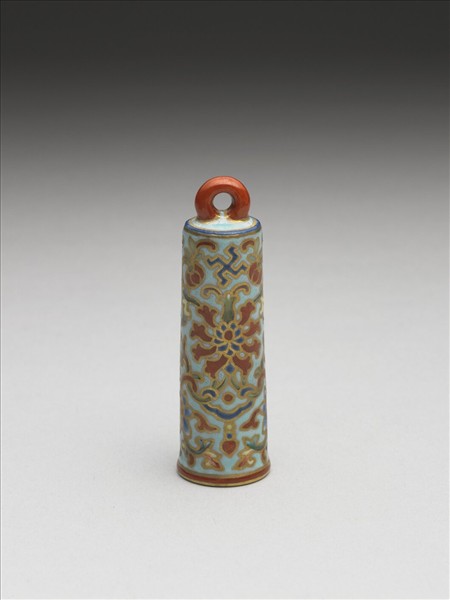 翎管是清代宮廷官員冠帽上的飾物。平頂,直筒形,器身上小下大,中空,無底,以插翎其中;頂端帶環形繫,使與帽相銜。藍地的管身裝飾著以金邊鉤勒出輪廓線的卍字、番蓮花、雲紋及卷草紋;並填以紅及藍色彩料。上下緣飾金邊,器裡作淺藍色。