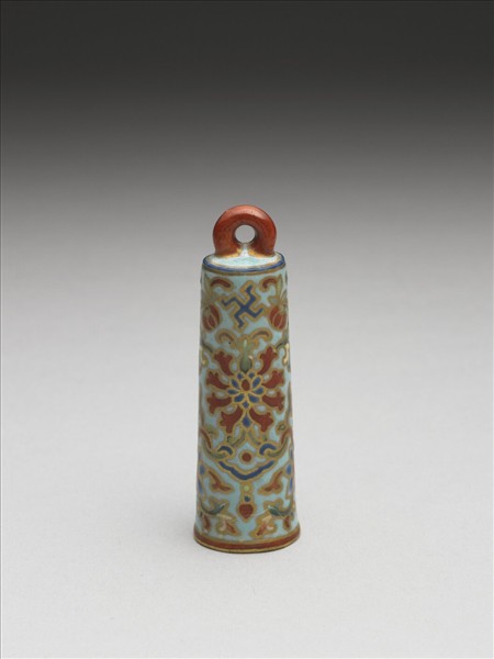 柱狀,上小下大,首有一環。管身飾粉彩卍字、番蓮花、雲紋、授帶,皆描金邊。