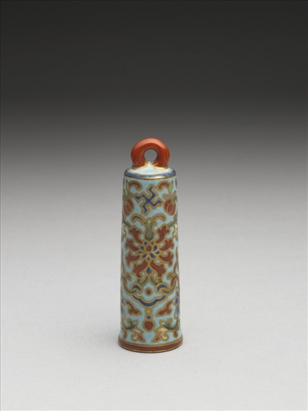 翎管是清代宮廷官員冠帽上的飾物。平頂,直筒形,器身上小下大,中空,無底,以插翎其中;頂端帶環形繫,使與帽相銜。藍地的管身裝飾著以金邊鉤勒出輪廓線的卍字、番蓮花、雲紋及卷草紋;並填以紅及藍色彩料。上下緣飾金邊,器裡作淺藍色。