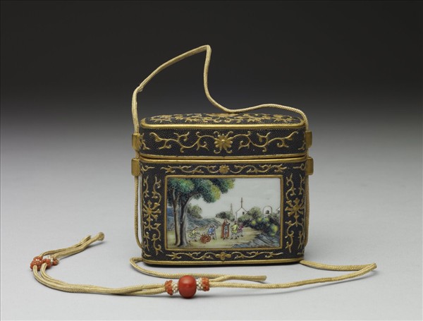 儲火鐮之用的盒子。扁圓形,分蓋與身兩部分,器蓋及盒身兩側作小耳,供穿繩提取,以使蓋與身不致脫離。四面開光,內繪西洋風景人物畫,特別是教堂屋頂出現的十字架,具體呈現因中西文化交流而出現的西方元素。開光以外的器面施黑釉,以錐拱技法作錦地點紋,其上再加飾凸起的金花,製造宛如皮格織繡的紋路與質地。器內壁及底外施湖綠釉,底心留白以紅料篆書「大清乾隆年製」六字款。
