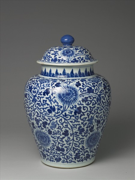 青花蓋罐,直口,口有傷。短直頸,鼓肩下斂,平底。腹外壁滿飾卷枝菊花。頸部繪飾花瓣紋一圈,由於成於乾隆間的《諸佛菩薩聖像贊》一書中,其佛像蓮座上之蓮瓣樣式與之類同,所以,頸部與外壁的裝飾應為蓮瓣紋。釉色略帶水氣,花瓣的暈染細緻,表現控制釉料呈色的良好技巧。蓋外壁裝飾與腹外壁同調,皆以卷枝菊花為飾。器底外露胎,無款識。應是燒成於清代的作品。