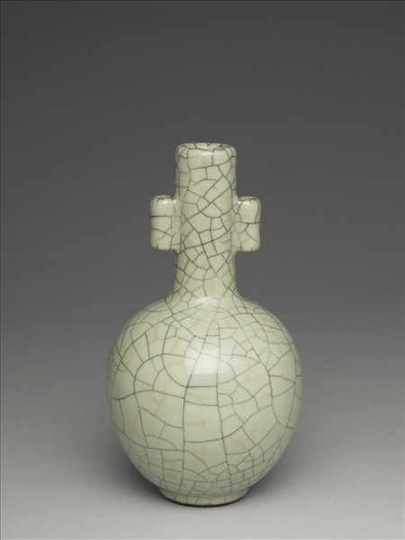 小口,直長頸,雙管耳,球腹,淺圈足。通體施仿哥釉,色灰青瑩潤,滿佈鐵灰色深淺開片紋。圈足露胎,塗赭色汁,底心青花書「大清乾隆年製」三行六字篆款。