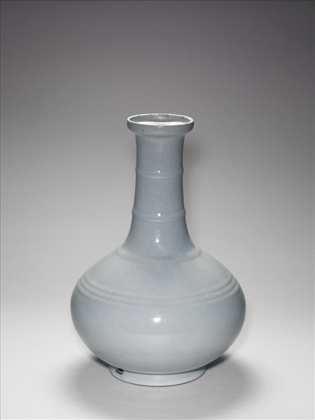 盤口,直長頸,斜肩,碩腹,圈足,足上有長方形穿孔二。通體施仿汝釉,色灰青光潤,面帶細密的冰裂紋,頸與腹部共飾弦紋六道。圈足露胎塗棕色汁,器底青花書「大清雍正年製」三行六字篆款。
