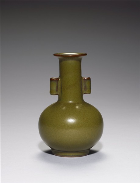 紙槌瓶,盤口,直長頸,圓腹,圈足,頸側雙貫耳。通體施茶葉末釉,口與耳上沿處露醬色。圈足露胎,中鈐印「雍正年製」雙行四字篆款。