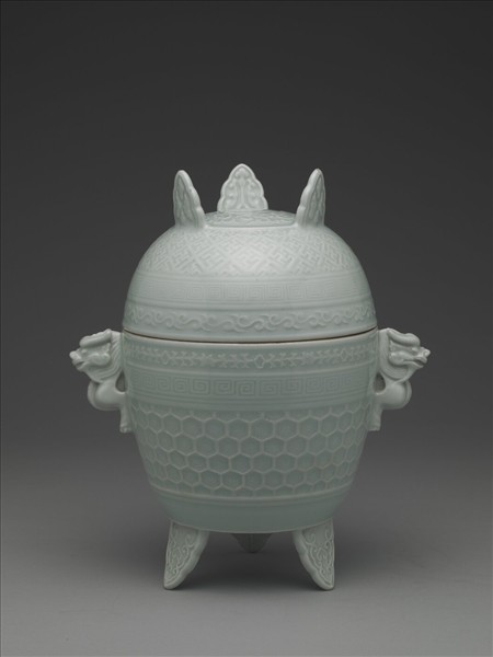 明朝以來官窯作坊即燒造太廟或祭壇所需的各類瓷禮器,參照《大明會典》所載,青、黃、赤、白四個顏色的器用,分別用來祭祀圓丘、方丘、日壇與月壇 。清朝沿襲舊制,「廟壇祭品遵古制,惟器用瓷」。乾隆十三年(1748),皇帝下詔:「祭品宜法古」,御窯廠燒造的瓷祭器包含豆、登、簠、簋、鉶、尊等各類仿銅的禮器。這些瓷祭器分別罩施不同的釉彩,使用於各種祭典,其中白瓷祭器常用於月壇。乾隆十三年頒佈《皇朝禮器圖式》,即出現與本器相同的「鉶」。鉶用來盛裝湯餚,作直式橢圓形,器體分作蓋與身兩部分,蓋上裝飾山形板棱三片,面錐印卷草、卍字與回紋。器身自上而下錐印卷草、回紋及龜背紋,足部作山形板棱,器身口沿兩側貼飾雙犧形耳,蓋內及底皆刻「大清乾隆年製」六字篆款。