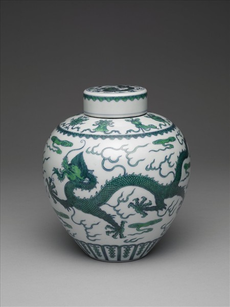 斂口,短頸,豐肩,碩腹下部斂收,凹足,帶平頂蓋一。蓋及壺身皆由青花勾畫紋飾之輪廓線、再填彩,一般稱之為「鬥彩」。在壺腹兩側各畫一行龍,龍身成波曲狀爬行於雲紋之間,在青花輪廓線內填以綠釉彩,在龍的周間畫火焰紋及朵雲紋,罐肩飾一圈佛教八吉祥及如意雲紋邊飾,腹下為蓮瓣紋飾,蓋面寬平,繪有一龍及火珠紋,隙地間飾火焰紋,蓋緣邊點以如意雲紋。底以青花書「大清乾隆年製」六字三行篆款。