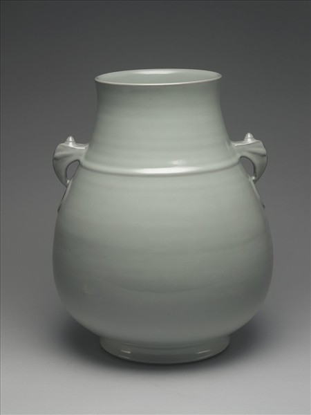 器仿銅壺形,頸兩側飾獸首銜環,圈足。頸肩相接處凸起一道弦紋,通體施青瓷釉,呈冬青色,釉色瑩潤,足底緣塗護胎汁,呈黑褐色,底以青花書「大清乾隆年製」三行六字篆款。