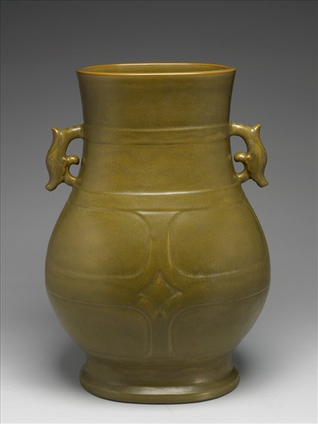 侈口直頸,雙龍耳,碩腹,圈足外撇。全器施罩茶葉末釉,釉色偏黃。頸部中央與頸肩交界處,各有帶狀弦紋一圈,腹外壁十字形帶狀凸起,有如交叉之帶子。這種裝飾意念,應是仿造固定綁束器物的帶子而來。圈足露胎一圈塗深褐色汁,足內滿釉,模印「大清乾隆年製」三行六字篆款。