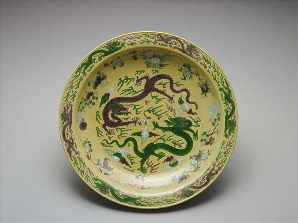 素三彩黃地褐綠雙龍紋盤