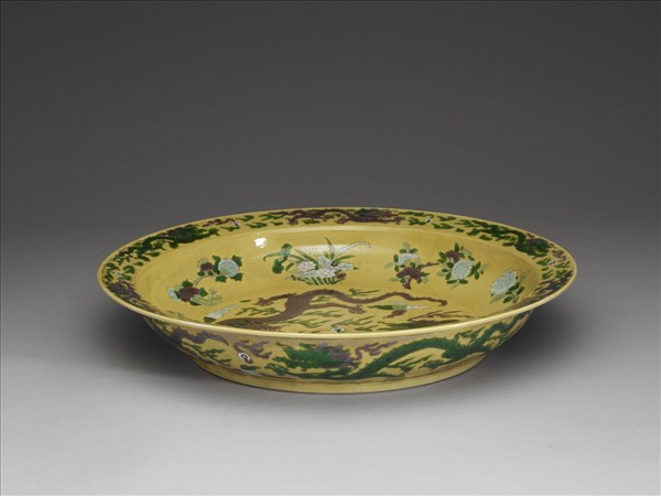 大盤,侈口、折沿、淺弧壁、平底、矮圈足。胎骨均勻,除足內外底施白釉,器內外壁均為黃地,上刻花再以綠、紫、白三彩繪紋飾,足緣露胎。全器以龍戲珠為題,器內口沿飾單龍戲珠一周,綠、紫二色雲龍交錯排列;內壁飾梅、菊、蓮荷、芙蓉、牡丹、芍藥等四季折枝花卉;內底為綠、紫雙龍戲珠,隙地填繪彩雲。器外口沿飾仙鶴及朵雲;外壁亦為單龍戲珠,隙地填繪彩雲。口緣、折沿、內底及外圈足分別刻有雙弦紋。器外底青花雙圈書「大清康熙年製」六字二行楷款。