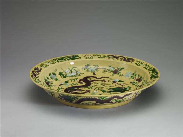 折沿大盤,侈口,寬折邊上揚,淺邊棱,淺弧壁,平底,寬圈足,口緣、內底外緣及圈足外各有兩圈刻痕。全器在刻線的紋飾上繪綠、褐、白三彩同紋的圖飾,並以黃釉為地。內底寬平,中心為綠、褐雙龍搶珠,隙地繪飾朵雲紋、火焰紋,內壁飾梅、菊、蓮、芙蓉、牡丹、芍藥等四季折枝花卉;折沿內側與外壁皆飾綠、褐行龍,隙地填繪焰狀彩雲、龍珠;折沿外側飾朵雲與仙鶴。圈足端緣露胎,外底白地,中央青花書「大清康熙年製」六字雙行雙圈楷款。