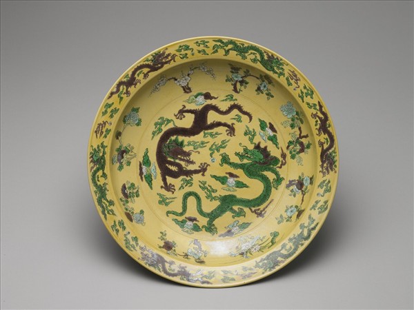 素三彩黃地褐綠雙龍紋盤