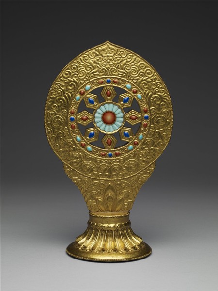 法輪象徵佛法不滅,一如輪子一樣的不停轉動。它和法螺、寶傘、白蓋、蓮花、金魚和盤長等共稱為八吉祥,它們經常出現於明清瓷器上,一般皆以圖繪來表示,鮮少直接燒出立體的造形。探就乾隆官窯燒造金彩法輪的原因,或能與當時的信仰背景作一連接,首先是皇帝本身信仰西藏佛教,在位之際頗欲借宗教的力量去招服少數民族,故常傳旨御窯廠燒造瓷七珍、八寶、佛塔和佛像等,一方面作為宗教儀式的供器,另一方面也作為賞賜西藏僧侶的禮物。 此作品上部為輪軸下部是台座,中心輪軸又分別以八個菱形的條幅與外廓相接,外廓的邊緣再綴飾以細小的聯珠紋。通體罩施金釉,釉下模印凸起的雲紋、卷草及蓮瓣紋,為了彰顯法輪具有的神聖寓意,以及金燦醒目的外表,特別以紅、藍、綠三色琺瑯彩,描繪宛如鑲嵌寶石的圖案。底以金彩描畫「大清乾隆年製」六字篆款。