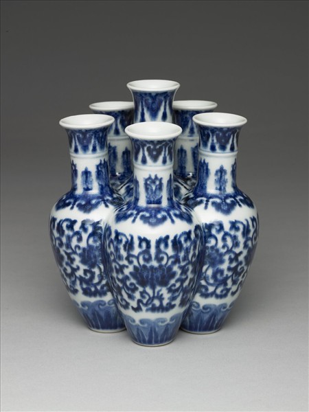 以中央主瓶為中心,五個撇口長頸瓶圈圍連接而成一六連瓶。除了中間一個頸部較長外,六個瓶子肩部及底部高度齊平,瓶身高度相同。外圍的五個相連瓶壁內部相通無隔,中間主瓶則由肩部至底部鑽數個洞孔與外連之五瓶相通。器表滿繪發色鮮艷但圖案漫漶不清的青花紋飾,頸部為纓絡紋及折枝變形花卉紋,肩部飾一圈如意勾連纓絡紋,瓶身為纏枝寶相花紋,近底部處並有一圈發色較淺的變形蕉葉紋。器底圈足內皆上透明釉,中央瓶底內有「大清乾隆年製」三行六字款。