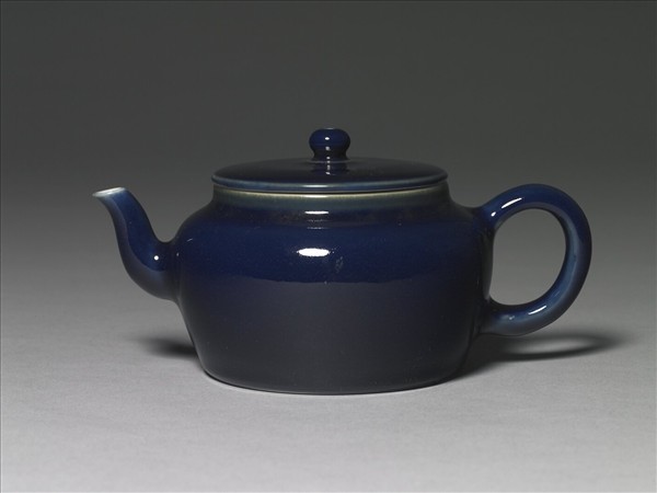 茶壺,直口,壺身短圓,由上而下略向內收,曲流,弓形把,平底凹足,帶平頂圓鈕蓋,並有氣孔設於鈕頂。器內、外底、蓋裏均施白釉,白釉微泛青;外壁、蓋面則滿施霽青釉,釉色勻潤光滑,口沿及流口釉薄處均露白邊。器底白地上青花書「大清雍正年製」六字二行楷款,外加雙圈。