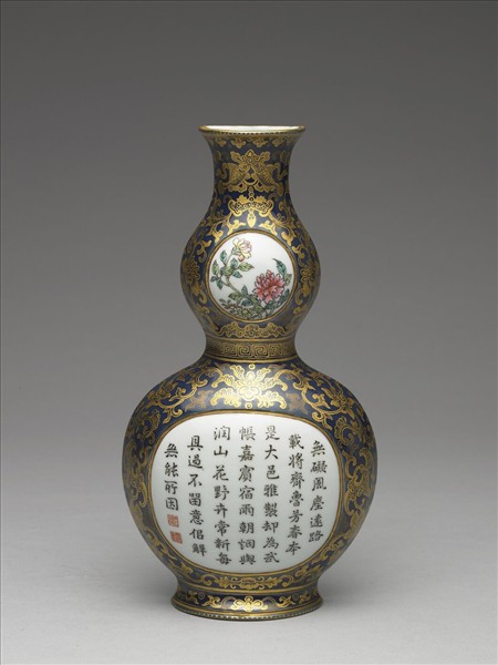 全器如縱剖半器,呈半面葫蘆瓶形,背為平面,有孔可穿繫固定於牆面或轎子之內,故有壁瓶或轎瓶之稱。清檔中稱之轎瓶。此瓶以霽青釉為地,上繪金彩圖案,口沿飾如意雲紋,葫蘆形上半部以金彩勾描圓形開光,內繪折枝牡丹,葫蘆形下半部以金彩勾描橢圓形開光,內書乾隆十三年(西元1748年)御製詩〈咏掛瓶〉:「無礙風塵遠路,載將齊魯芳春,本是大邑雅製,卻為武帳嘉賓,宿雨朝烟與潤,山花野卉常新,每具過不留意,似解無能所因。」詩末落紅料描繪的「乾」、「隆」印文兩枚。上部開光外裝飾有雙魚及磬,腰部繪一圈回紋,下方開光兩側各有一蝙蝠紋,其餘填以朵花紋,背部周圍繪五瓣花紋。足底塗金,底施淺藍釉,上以紅料書「乾隆年製」單行橫向篆款。