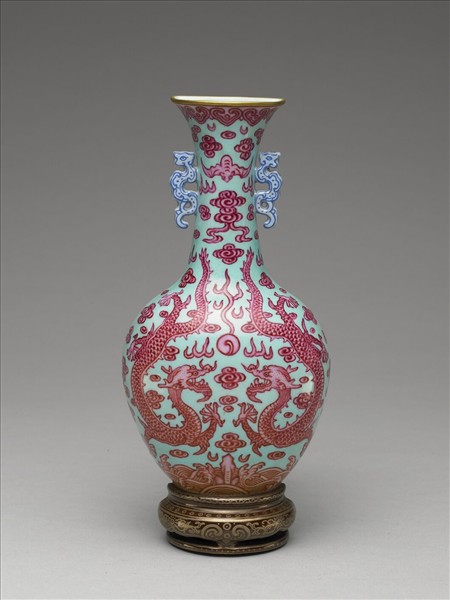 洋彩湖綠地紅龍紋雙耳轎瓶