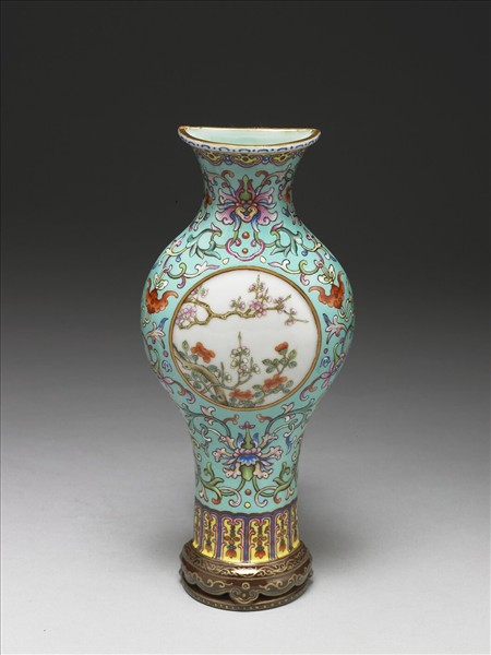 前面為撇口短頸斜肩上豐下斂腹瓶,下接如意雲足座,靠牆面平,背部有四圓孔及一方梯形凹入,可以直接掛在牆面的釘上,故稱壁瓶,清檔中稱之轎瓶。此瓶淺藍地,以五彩繪製圖紋,口沿繪如意雲紋,瓶身中心有圓形金邊開光繪白地梅花、月季紋。開光周圍圍繞蝙蝠、纏枝番蓮、朵花紋,腹下繪一圈蓮瓣紋。座為褐地繪金色卷草紋及如意雲紋,底為褐地金書「乾隆年製」單行橫向篆款。