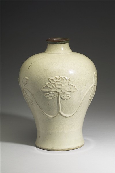 小口外撇,短頸,豐肩,碩腹下斂,平口,圈足,口緣鑲銅邊。通體施白釉,色牙白泛黃,帶細密的淺灰色開片,腹部飾堆花連枝牡丹紋。器底無釉,露淡黃色胎。