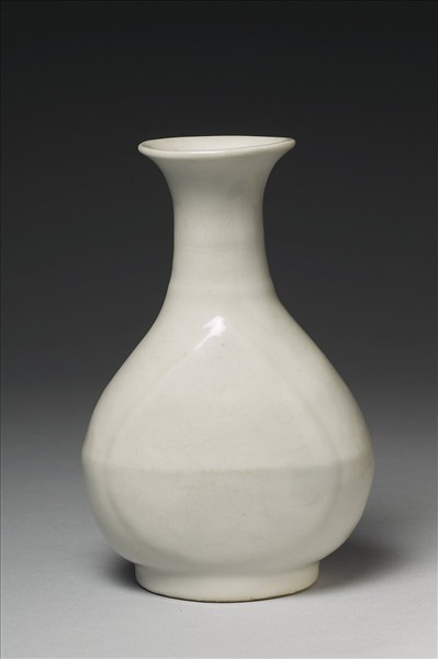 這件白瓷杏葉瓶侈口、長頸、削肩,器腹扁圓略似杏形,帶圈足。全器施溫潤白釉,足底有楷書「大明萬曆年製」六字二行刻款。器腹前後作杏葉形凸出,線劃折枝牡丹紋,頸部及器腹兩旁則刻劃蕉葉及花卉紋。杏葉瓶是明代晚期流行的一種瓶子的種類。不論是瓷器、金銀器或墓葬中陪葬的錫製品,杏葉瓶或杏葉形執壺是極能反映時代氛圍的一種瓶式。而白釉暗花的裝飾技法,更是沿襲自明代早期永樂以來甜白瓷器的裝飾傳統,展現出變動之下不變的一面。(引自《亞洲探險記:十七世紀東西交流傳奇》)