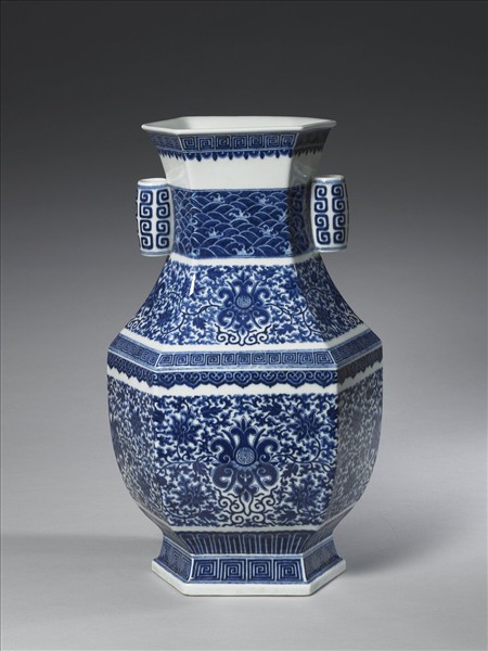 雙管耳壺,全器呈扁六邊形,自口至足,邊棱清晰。侈口,長頸,斜肩下折,直腹下方收斂,肩線折棱清晰,圈足外撇;頸兩側具管狀貫耳。器表繪青花圖紋,口緣一周回紋及垂葉紋,頸部畫波濤紋及纏枝番蓮紋,耳飾回紋。腹頸相間處一周回紋及如意雲紋,腹部畫纏枝番蓮,近足處繪一圈蓮瓣紋。足部飾回紋,圈足緣露胎,底以青花書「大清乾隆年製」六字三行篆款。