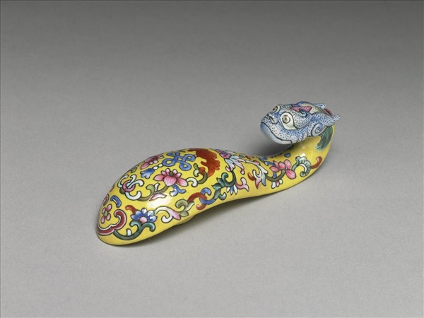 帶鈎是古人扣接腰帶,或配掛鏡囊、印章、刀鞘、錢幣或玉佩等飾品的服飾用具。琵琶形,鈎首為彎曲的龍頭狀,背面設圓鈕。龍首以黑線勾勒出各細部輪廓,再填點上藍地。龍角及鬃毛順著帶鈎形狀描繪,一體成形。黃彩地的器身,紋飾分內外兩圈,內圈繪紅蝠啣盤長與雙蓮卷草紋;外圈以雙蓮纏枝紋為飾,近底部以紅白線條勾勒簡單的開光如意,其間裝飾一朵四瓣花。