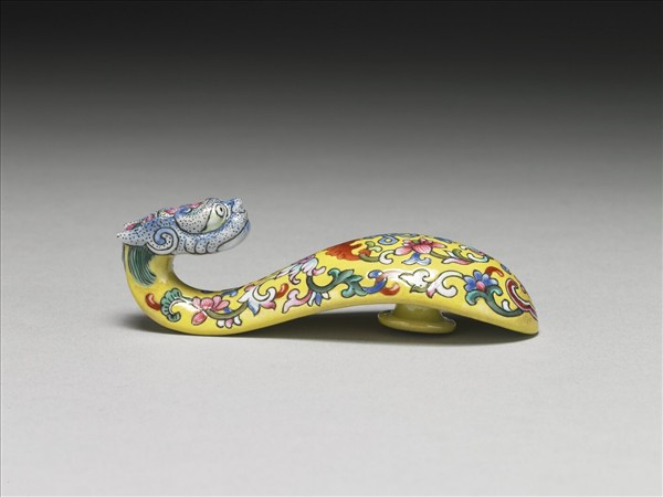 帶鈎是古人扣接腰帶,或配掛鏡囊、印章、刀鞘、錢幣或玉佩等飾品的服飾用具。琵琶形,鈎首為彎曲的龍頭狀,背面設圓鈕。龍首以黑線勾勒出各細部輪廓,再填點上藍地。龍角及鬃毛順著帶鈎形狀描繪,一體成形。黃彩地的器身,紋飾分內外兩圈,內圈繪紅蝠啣盤長與雙蓮卷草紋;外圈以雙蓮纏枝紋為飾,近底部以紅白線條勾勒簡單的開光如意,其間裝飾一朵四瓣花。