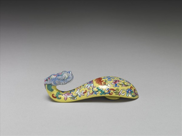 帶鈎是古人扣接腰帶,或配掛鏡囊、印章、刀鞘、錢幣或玉佩等飾品的服飾用具。琵琶形,鈎首為彎曲的龍頭狀,背面設圓鈕。龍首以黑線勾勒出各細部輪廓,再填點上藍地。龍角及鬃毛順著帶鈎形狀描繪,一體成形。黃彩地的器身,紋飾分內外兩圈,內圈繪紅蝠啣盤長與雙蓮卷草紋;外圈以雙蓮纏枝紋為飾,近底部以紅白線條勾勒簡單的開光如意,其間裝飾一朵四瓣花。