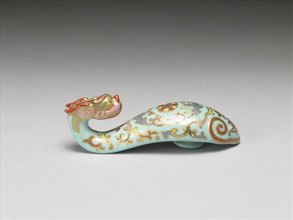 琵琶形,鈎首為彎曲的龍頭狀,背面設圓鈕。帶鈎是古人扣接腰帶,或配掛鏡囊、印章、刀鞘、錢幣或玉佩等飾品的服飾用具。龍首為粉色彩地,以金線勾勒龍首及鬃毛,龍鼻及龍角塗繪鮮豔的紅色,龍眼以泥金描繪,整體線條流暢,雍容貴氣。器身以綠彩為地,和龍首相同以金彩勾勒器身紋飾。紋飾分內外兩圈,外圈以龍頸的四瓣花紋為首,向下連接卷草紋,近底處以金線勾框,內填紅色如意為飾,其中以番蓮紋為主花,花蕊凸出連接一朵四瓣花。內圈以描金藍彩雙蝠和壽桃為邊飾,中間飾一朵團花卉。