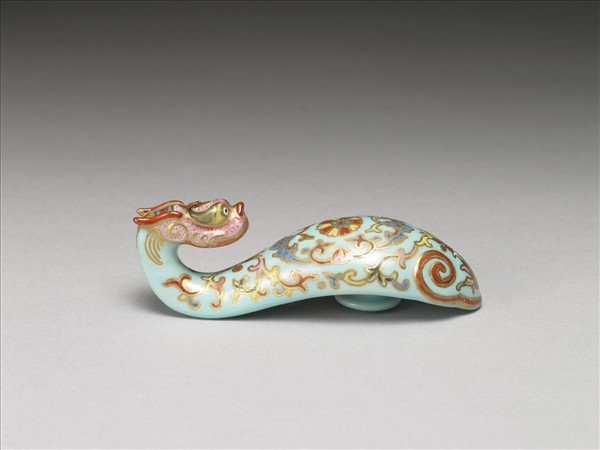 琵琶形,鈎首為彎曲的龍頭狀,背面設圓鈕。帶鈎是古人扣接腰帶,或配掛鏡囊、印章、刀鞘、錢幣或玉佩等飾品的服飾用具。龍首為粉色彩地,以金線勾勒龍首及鬃毛,龍鼻及龍角塗繪鮮豔的紅色,龍眼以泥金描繪,整體線條流暢,雍容貴氣。器身以綠彩為地,和龍首相同以金彩勾勒器身紋飾。紋飾分內外兩圈,外圈以龍頸的四瓣花紋為首,向下連接卷草紋,近底處以金線勾框,內填紅色如意為飾,其中以番蓮紋為主花,花蕊凸出連接一朵四瓣花。內圈以描金藍彩雙蝠和壽桃為邊飾,中間飾一朵團花卉。