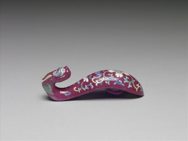 琵琶形,鈎首為彎曲的龍頭狀,背面設圓鈕。帶鈎是古人扣接腰帶,或配掛鏡囊、印章、刀鞘、錢幣或玉佩等飾品的服飾用具。整器以紅彩為地,龍角及鬃毛順著帶鈎形狀描繪,一體成形。器腹飾團壽花卉紋,上承藍色蝙蝠及白蓮,其側以卷草紋勾勒繪製而成。