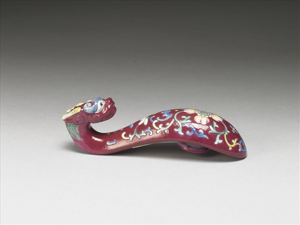琵琶形,鈎首為彎曲的龍頭狀,背面設圓鈕。帶鈎是古人扣接腰帶,或配掛鏡囊、印章、刀鞘、錢幣或玉佩等飾品的服飾用具。整器以紅彩為地,龍角及鬃毛順著帶鈎形狀描繪,一體成形。器腹飾團壽花卉紋,上承藍色蝙蝠及白蓮,其側以卷草紋勾勒繪製而成。