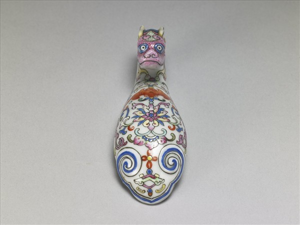 瓷製帶鈎,鈎首作一回首龍頭,龍身扭曲呈S形微拱,底部帶一圓銎。全器以白釉為地,以黑線仔細描繪龍首五官與器身中央之番蓮紋,並於番蓮紋上、下端分飾磬形圖案與紅色蝙蝠。器底飾一藍白如意雲紋,周圍隙地飾描黑葉紋與粉紅鳳紋。龍首面部與耳朵分飾淺施粉紅釉與淺黃釉,並點染粉紅斑。帶鈎底部有六個支燒痕,並以金彩描繪朵花紋。全器用色繽紛多彩,紋飾造型亦生動活潑。