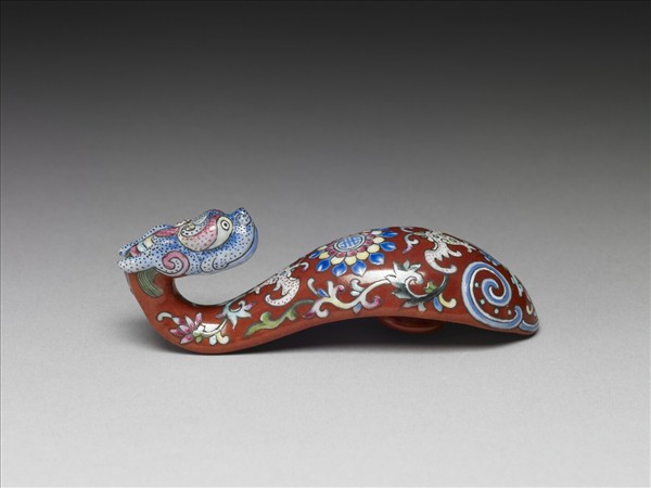 瓷製帶鉤,鉤首作一回首龍頭,鉤身微拱呈S形,底部帶一圓鈕。全器除龍首為白地外,餘以紅釉為地,並以黑線仔細描繪龍首五官與器身各式花紋。器身中央繪飾一朵重瓣花,花心帶一團壽字。花朵上、下端各飾一白色蝙蝠。器底飾一藍白如意雲紋與磬形圖案,周圍隙地飾描黑葉紋。龍首以白釉為地,薄施淺藍釉並點染黑斑。全器用色繽紛多彩,紋飾造型亦生動活潑。