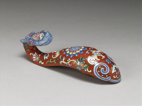 瓷製帶鈎,鈎首作一回首龍頭,鈎身微拱呈S形,底部帶一圓鈕。全器除龍首為白地外,餘以紅釉為地,並以黑線仔細描繪龍首五官與器身各式花紋。器身中央繪飾一朵重瓣花,花心帶一團壽字。花朵上、下端各飾一白色蝙蝠。器底飾一藍白如意雲紋與磬形圖案,周圍隙地飾描黑葉紋。龍首以白釉為地,薄施淺藍釉並點染黑斑。全器用色繽紛多彩,紋飾造型亦生動活潑。