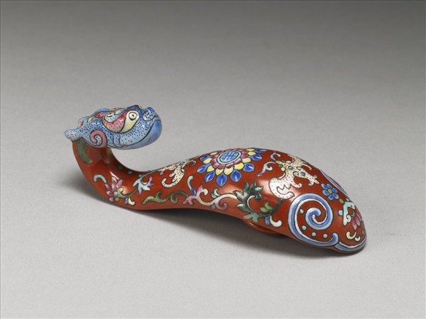 瓷製帶鉤,鉤首作一回首龍頭,鉤身微拱呈S形,底部帶一圓鈕。全器除龍首為白地外,餘以紅釉為地,並以黑線仔細描繪龍首五官與器身各式花紋。器身中央繪飾一朵重瓣花,花心帶一團壽字。花朵上、下端各飾一白色蝙蝠。器底飾一藍白如意雲紋與磬形圖案,周圍隙地飾描黑葉紋。龍首以白釉為地,薄施淺藍釉並點染黑斑。全器用色繽紛多彩,紋飾造型亦生動活潑。
