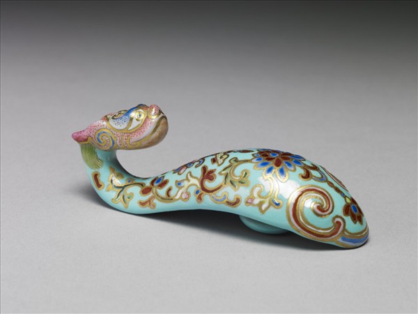 瓷製帶鈎,鈎首作一回首龍頭,鈎身微拱呈S形,底部帶一圓鈕。全器除龍首為白地外,餘以湖綠釉為地,並以粗金線描繪龍首五官與器身各式花紋。器身中央繪飾一朵重瓣花,花朵上端飾一白色磬形圖案。器底飾一如意雲紋,周圍隙地飾描金葉紋。龍首以白釉為地,薄施粉紅釉並點染紅斑。器底帶有六個被湖綠釉覆蓋之支燒痕。全器用色繽紛多彩,紋飾輪廓較奔放不拘小節。