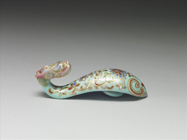 瓷製帶鈎,鈎首作一回首龍頭,鈎身微拱呈S形,底部帶一圓鈕。全器除龍首為白地外,餘以湖綠釉為地,並以粗金線描繪龍首五官與器身各式花紋。器身中央繪飾一朵重瓣花,花朵上端飾一白色磬形圖案。器底飾一如意雲紋,周圍隙地飾描金葉紋。龍首以白釉為地,薄施粉紅釉並點染紅斑。器底帶有六個被湖綠釉覆蓋之支燒痕。全器用色繽紛多彩,紋飾輪廓較奔放不拘小節。