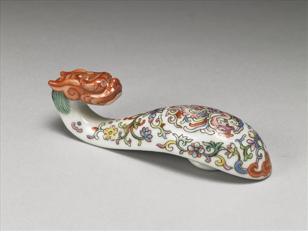 瓷製帶鈎,鈎首作一回首龍頭,鈎身微拱呈S形,底部帶一圓鈕。全器以白釉為地,龍首薄施磚紅釉並點染紅斑。全器以黑線描繪龍首五官與鈎身各式花紋。鈎身表面中央繪飾一隻團形鳳凰,周身鳥羽華麗多彩。底部有一展翅蝙蝠,周圍隙地飾滿捲曲花葉紋。器底帶有五個支燒痕,上飾點金彩朵花。全器用色鮮豔奪目,紋飾描繪細膩而工整。