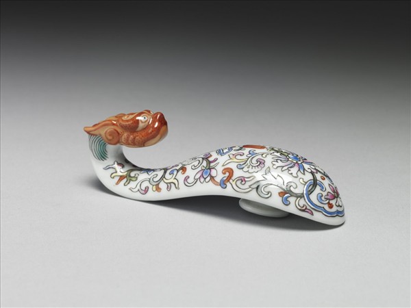 瓷製帶鈎,鈎首作一回首龍頭,鈎身微拱呈S形,底部帶一圓鈕。全器以白釉為地,龍首薄施磚紅釉並點染紅斑。全器以黑線描繪龍首五官與鈎身各式花紋。鈎身表面中央繪飾一隻團形鳳凰,周身鳥羽華麗多彩。底部有一展翅蝙蝠,周圍隙地飾滿捲曲花葉紋。器底帶有五個支燒痕,上飾點金彩朵花。全器用色鮮豔奪目,紋飾描繪細膩而工整。