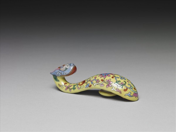 瓷製帶鉤,鉤首作一回首龍頭,鉤身微拱呈S形,底部帶一圓鈕。全器以黃釉為地,龍首為白地,並點染藍、紅各色斑點。全器以黑線描繪龍首五官與鉤身各式花紋。鉤身表面中央繪飾紅色蝙蝠與一重瓣花卉,隙地飾滿捲曲花葉紋。器底帶有六個被黃釉覆蓋之支燒痕。全器用色鮮豔奪目,紋飾描繪細膩生動。