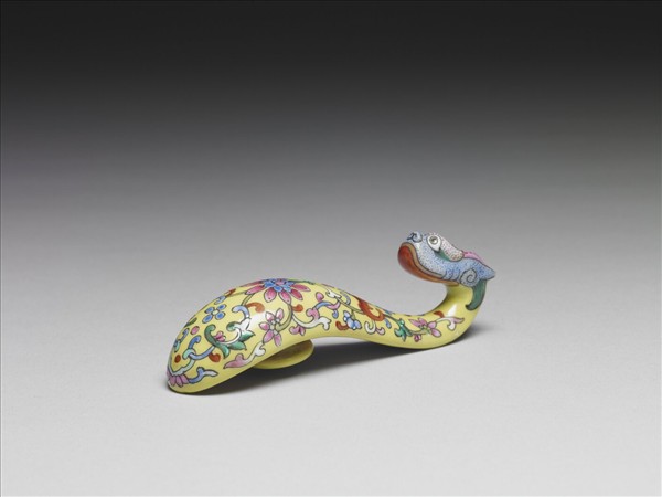 瓷製帶鉤,鉤首作一回首龍頭,鉤身微拱呈S形,底部帶一圓鈕。全器以黃釉為地,龍首為白地,並點染藍、紅各色斑點。全器以黑線描繪龍首五官與鉤身各式花紋。鉤身表面中央繪飾紅色蝙蝠與一重瓣花卉,隙地飾滿捲曲花葉紋。器底帶有六個被黃釉覆蓋之支燒痕。全器用色鮮豔奪目,紋飾描繪細膩生動。