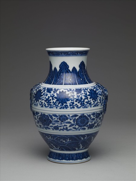 圓口外侈,短頸,豐肩圓弧腹,圈足外撇,肩貼飾銜環鋪首雙耳。口緣飾波濤紋一圈,頸飾蕉葉紋,腹壁以轉枝番蓮與波濤紋為飾,足有蓮瓣紋一圈。器底以青花書「大清乾隆年製」三行六字篆款。