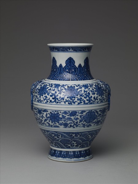 圓口外侈,短頸,豐肩圓弧腹,圈足外撇,肩貼飾銜環鋪首雙耳。口緣飾波濤紋一圈,頸飾蕉葉紋,腹壁以轉枝番蓮與波濤紋為飾,足有蓮瓣紋一圈。器底以青花書「大清乾隆年製」三行六字篆款。