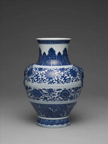 圓口外侈,短頸,豐肩圓弧腹,圈足外撇,肩貼飾銜環鋪首雙耳。口緣飾波濤紋一圈,頸飾蕉葉紋,腹壁以轉枝番蓮與波濤紋為飾,足有蓮瓣紋一圈。器底以青花書「大清乾隆年製」三行六字篆款。