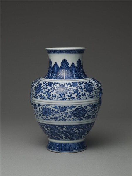 圓口外侈,短頸,豐肩圓弧腹,圈足外撇,肩貼飾銜環鋪首雙耳。口緣飾波濤紋一圈,頸飾蕉葉紋,腹壁以轉枝番蓮與波濤紋為飾,足有蓮瓣紋一圈。器底以青花書「大清乾隆年製」三行六字篆款。