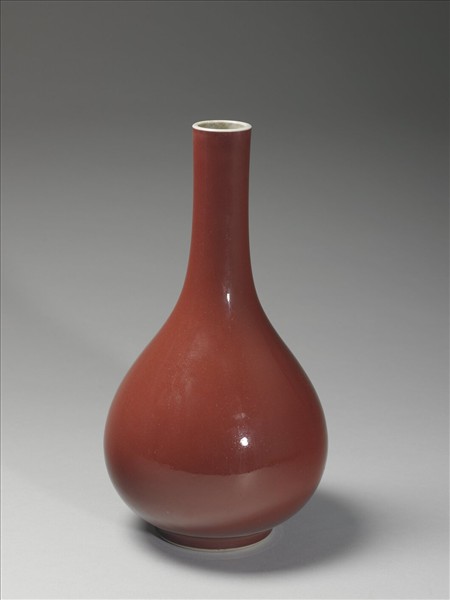 小口,細長頸,斜肩,碩腹,圈足。器身施霽紅釉,明豔勻亮,口、器裡與底白釉,全器光素無紋飾。圈足露白胎,底青花書「大清雍正年製」雙行六字楷款,外加雙圈。